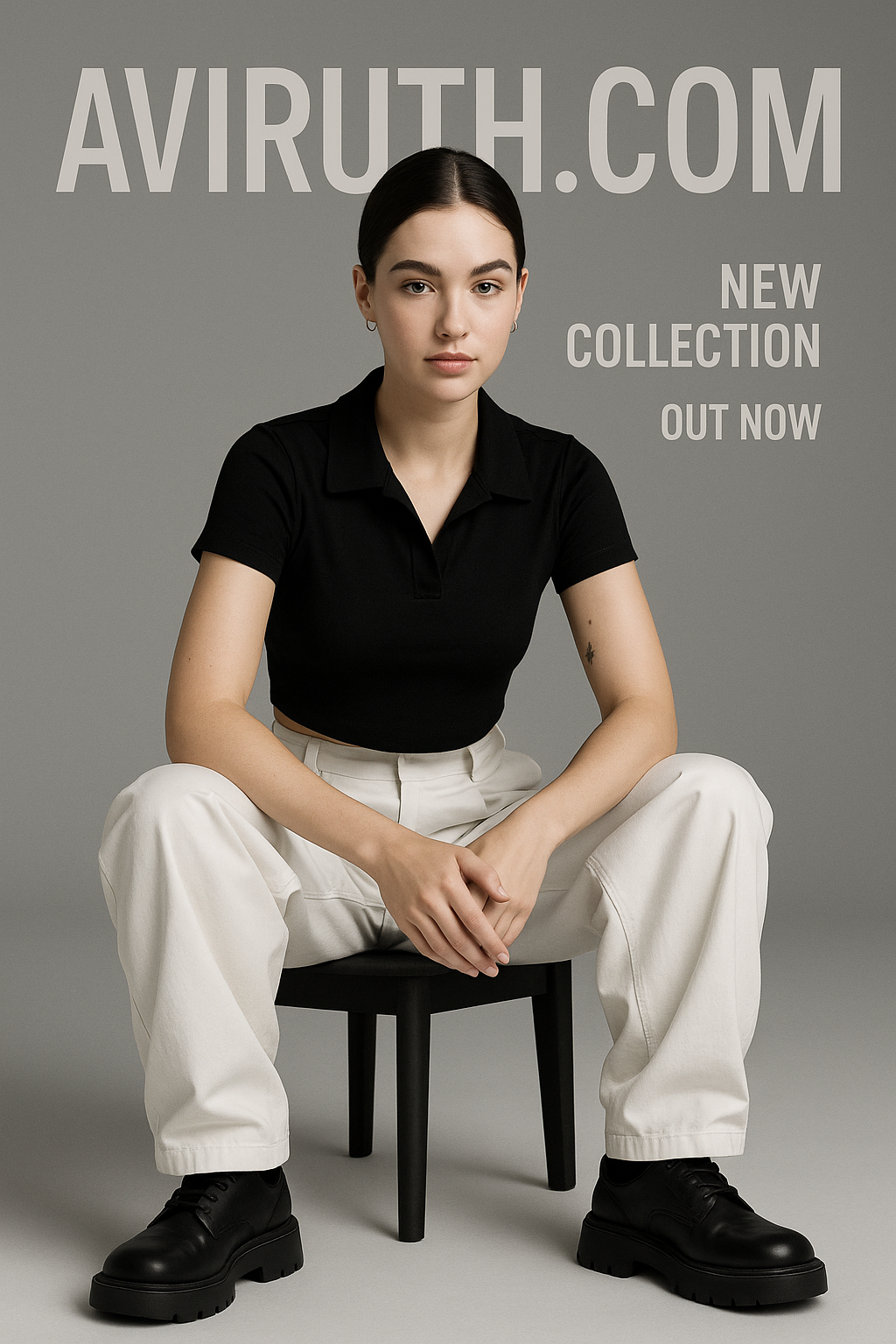 โปสเตอร์แฟชั่นมินิมอล แต่งหน้าอ่อนนุ่ม นั่งมั่นใจบนเก้าอี้เตี้ย สวมเสื้อครอปแขนสั้นสีดำแบบมีปก กางเกงคาร์โก้สีขาวทรงโอเวอร์ไซส์ รองเท้าทรงหนาสีดำ มือประสานกันระหว่างขา จ้องกล้องด้วยสีหน้ามั่นใจ มีรอยสักเล็กๆที่แขน ฉากหลังเรียบเป็นสีเทาไล่เฉด มีตัวอักษร “aviruth.com” ขนาดใหญ่อยู่ด้านหลัง พร้อมข้อความโปรโมชั่นด้านข้าง แสงในสตูดิโอนุ่ม ไม่มีเงาแข็ง ใช้โทนสีขาว ดำ เทา แบบโมโนโครม