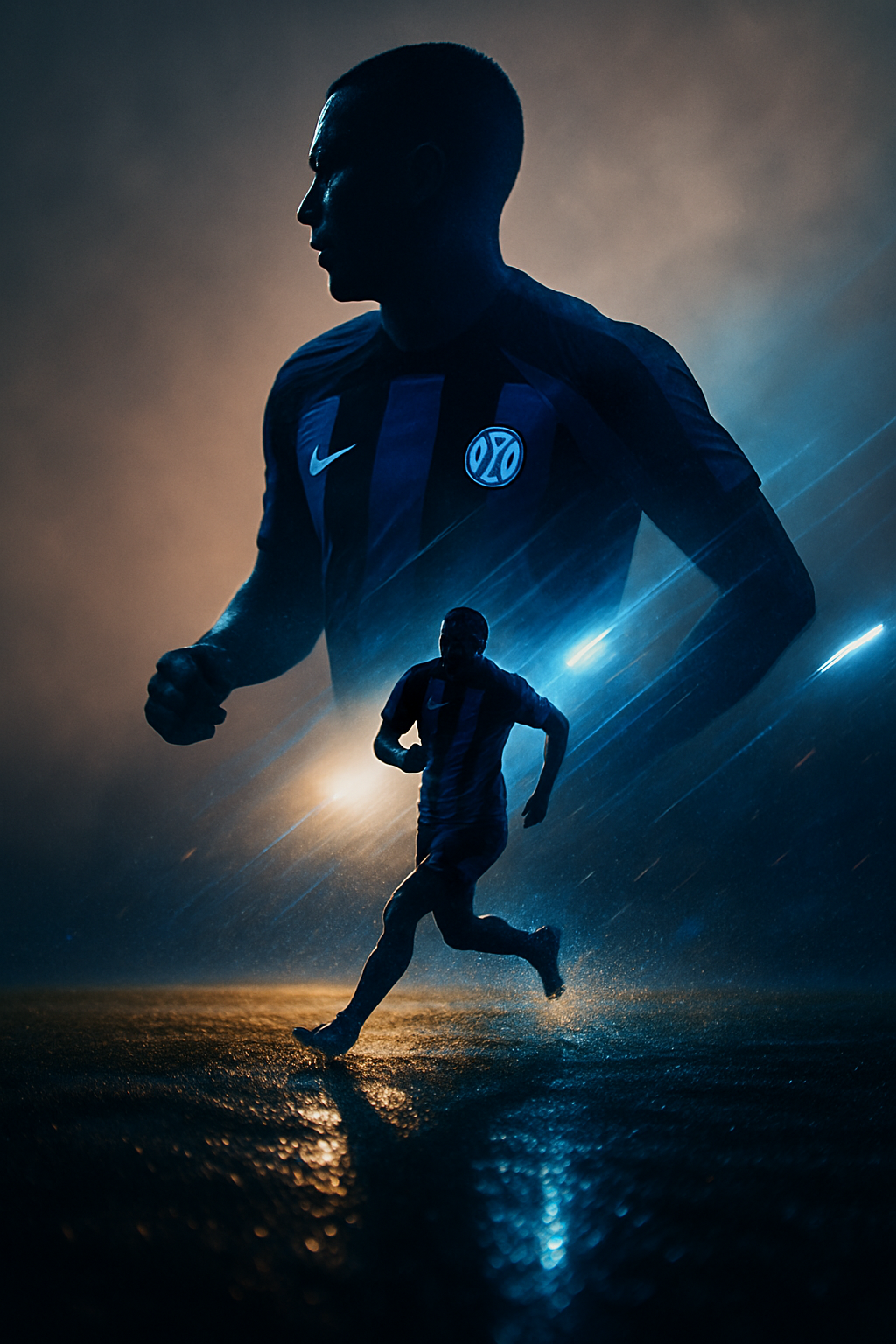 A futuristic visual masterpiece with a double exposure technique, featuring the silhouette of a legendary football player wearing the signature blue and black jersey of Inter Milan. The silhouette depicts the player running energetically on a wet pitch illuminated by stadium lights at dusk. The grass reflects the light, displaying a hyper-realistic texture, with shades of dark blue, white, and golden shimmer. The background features a warm gray mist gradation with cool light, creating a cinematic and emotional atmosphere. Sharp lighting accented with blue and white, with motion blur effects and water reflections on the pitch, provides a sense of depth, drama, and energy, celebrating the player's glory. -ar 9:16-v 5-style cinematic-detail 1.45 --hyperrealistic--lighting: studio + stadium fusion