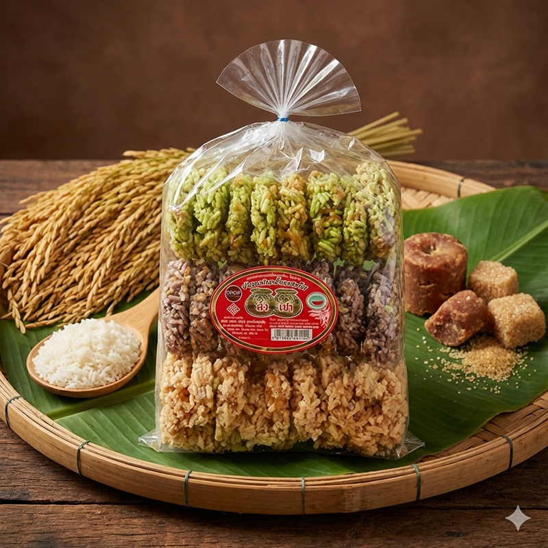 ช่วยสร้างภาพถ่ายผลิตภัณฑ์ขนมข้าวแต๋นจากรูปที่แนบ โดยให้สินค้าที่แนบอยู่ในถุงเหมือนต้นฉบับ 100% แค่เปลี่ยนพื้นหลังและเพิ่มเติมองค์ประกอบที่ตกแต่งสินค้า โดยให้จัดวางอย่างสวยงามในสไตล์ธรรมชาติ และเปลี่ยนพื้นหลังโดยมีองค์ประกอบหลักดังนี้: