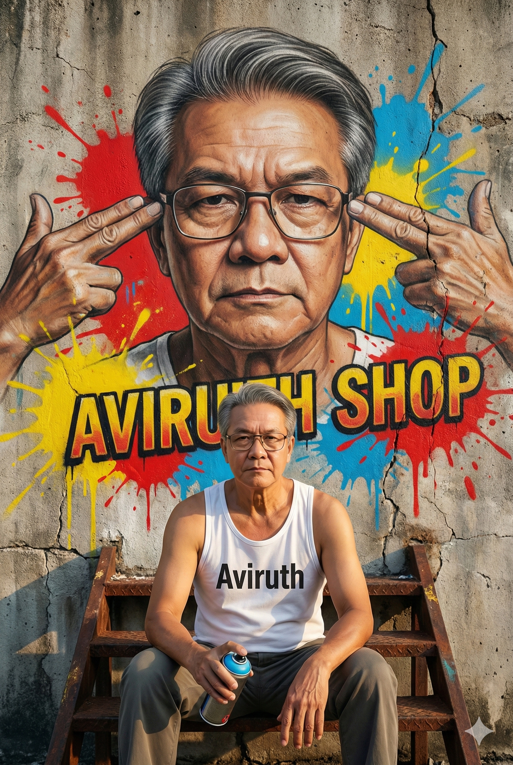 Street Art Realism – ทีมไทยบนกำแพงกราฟฟิตี้ ชายชาวไทย (using 100% unaltered face feature of reference photo / Face Lock 1000%) นั่งบนบันไดเหล็ก ถือสเปรย์สีฟ้าอย่างมั่นใจเสื้อกล้ามสีขาวพิมพ์คำว่า “Aviruth” สีดำขนาดกลางบริเวณอก บนกำแพงด้านหลังมีภาพวาดใบหน้าเขาเองขนาดใหญ่มือในภาพ mural ทำท่าชูนิ้วโป้งและนิ้วชี้เป็นรูปปืนคู่ (finger guns pose) รอบ mural มี splash สีสด แดง เหลือง น้ำเงิน ตัวอักษร “AVIRUTH SHOP” ตัวใหญ่กลางภาพ แสงธรรมชาติช่วงสาย นุ่มนวล, ผนังคอนกรีตหยาบมีรอยแตกร้าวสมจริง คุณภาพระดับ 8K, hyper-photorealistic, HDR, depth cinematic tone