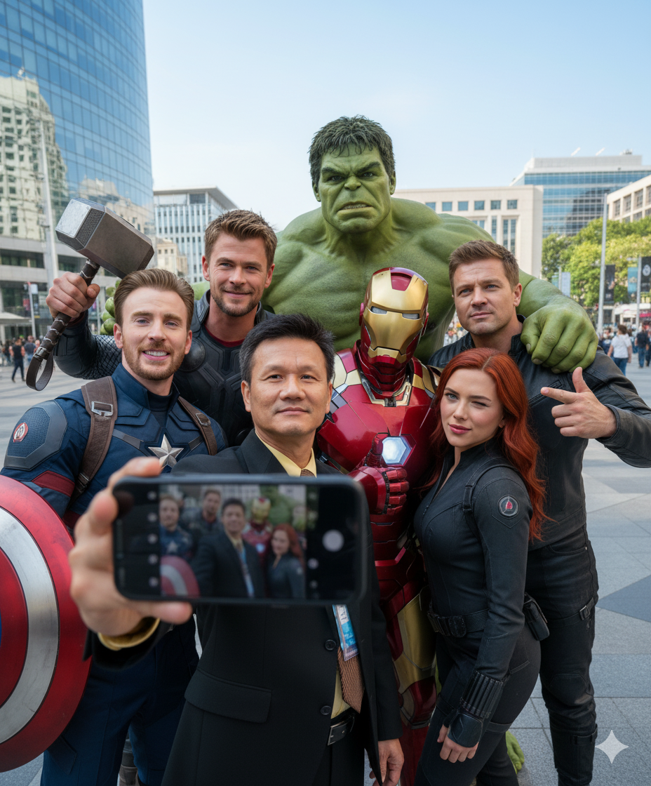 Create a photorealistic group selfie. Position the subject holding a smartphone, surrounded by members of The Avengers: Iron Man, The Hulk, Captain America (Chris Evans), Thor (Chris Hemsworth), Hawkeye (Jeremy Renner), and Black Widow (Scarlett Johansson). Everyone is smiling and posing as if they're friends. This selfie has a fun and lively atmosphere. Everyone is in the frame close to each other, and some characters are leaning forward playfully. The daylight is bright, the quality is cinematic, the colors are natural, and the details are sharp.