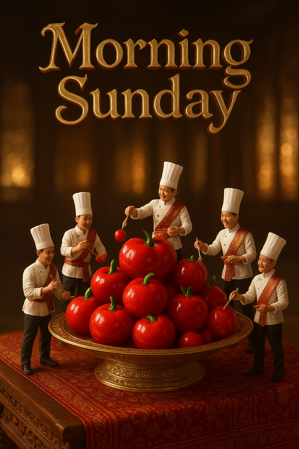 { "prompt": "Luxurious 3D VFX of Thai dessert Luk Chup (red mung bean fruit sweets) shaped like glossy red cherries and pomegranates, piled elegantly on an ornate engraved golden Thai plate. The plate rests on a carved teak wood Thai table draped with luxurious red-and-gold patterned Thai silk. Seven miniature chefs in Thai-inspired chef uniforms with elegant red-and-gold silk 'sabai' sashes draped over their shoulders joyfully paint, arrange, and lift the glossy red Luk Chup with tiny golden utensils. The background is a softly blurred traditional Thai hall with golden bokeh light streaming through carved wooden windows, evoking a regal mood. Large ornate 3D text 'Morning Sunday' in an elegant Thai-inspired golden font with red velvet undertones floats above the scene. Cinematic lighting, hyper-realistic detail, and ornate royal Thai composition. Image ratio 9:16.", "size": "9:16", "style": ["luxury", "Thai-traditional", "ornate", "cinematic", "hyper-realistic"] }
